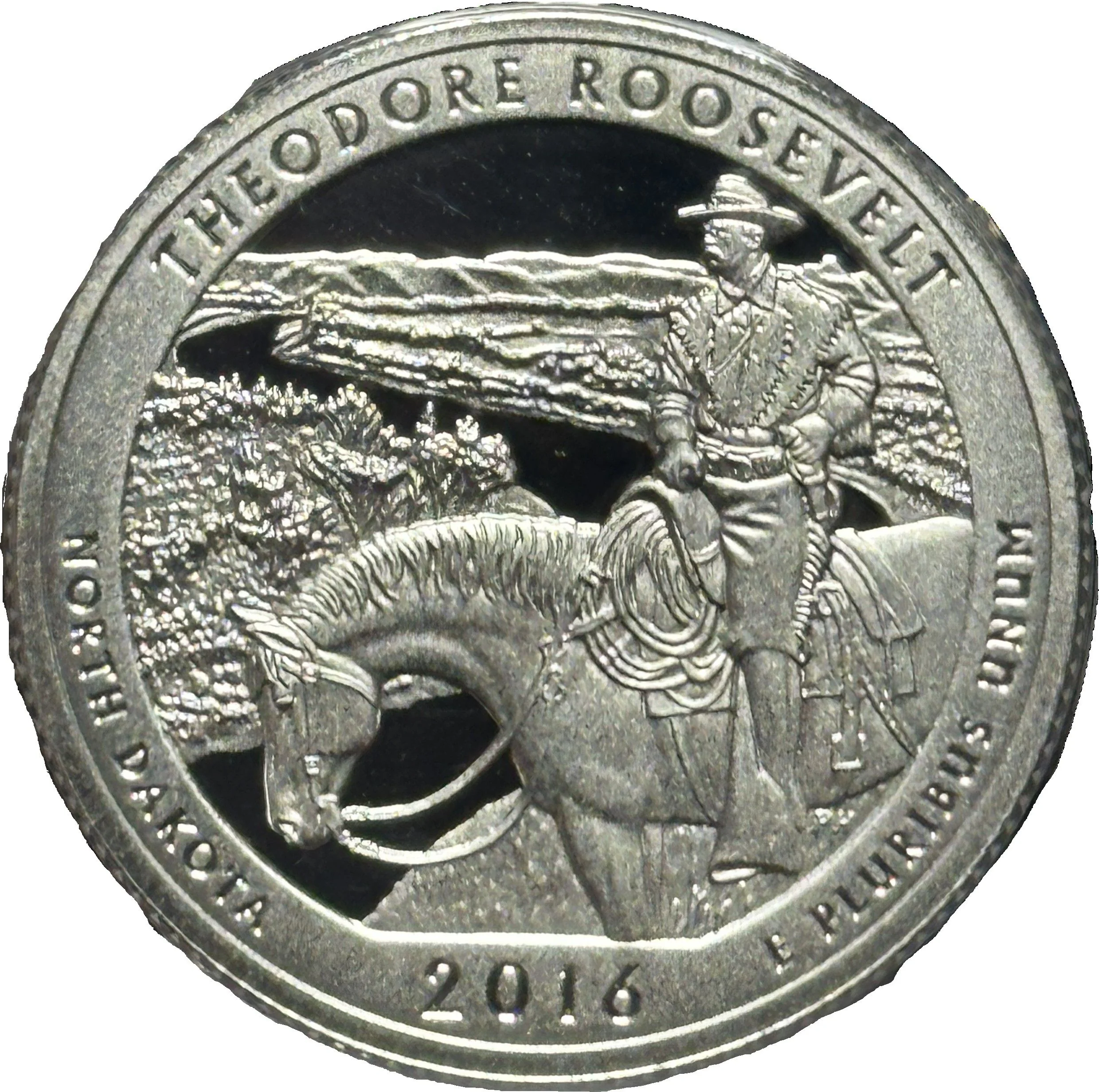 Young Theodore Roosevelt on horseback near the Little Missouri River. Inscriptions: "THEODORE ROOSEVELT," "NORTH DAKOTA," "2016," and "E PLURIBUS UNUM."