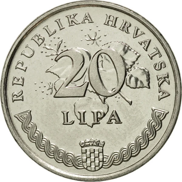 A stylized linden branch with blossoms and numeral values on its leaves, "LIPA" below, the country name above, and the Croatian coat of arms between braided ornaments at the bottom.