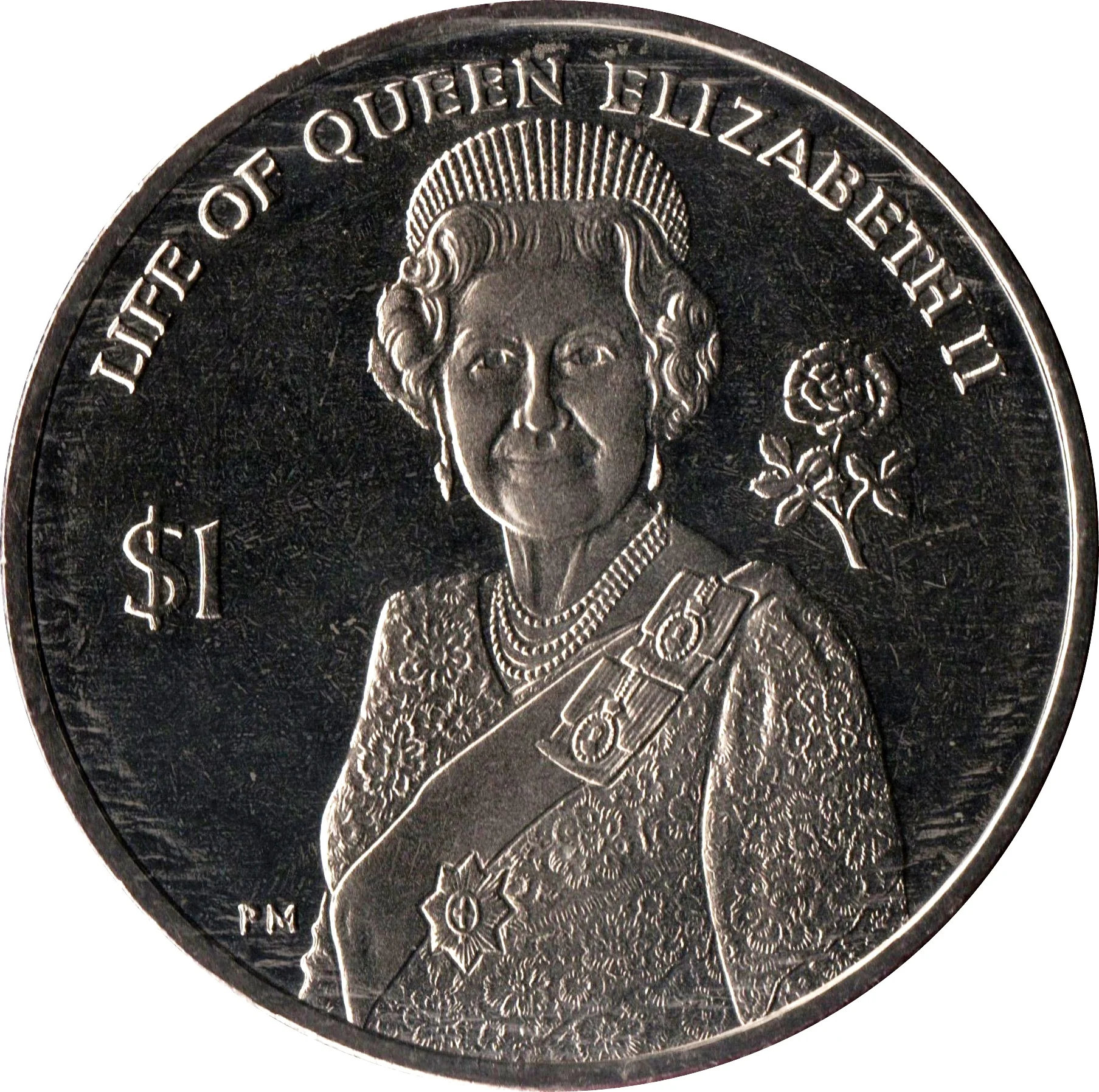 Portrait of Queen Elizabeth II with a flower to the right.