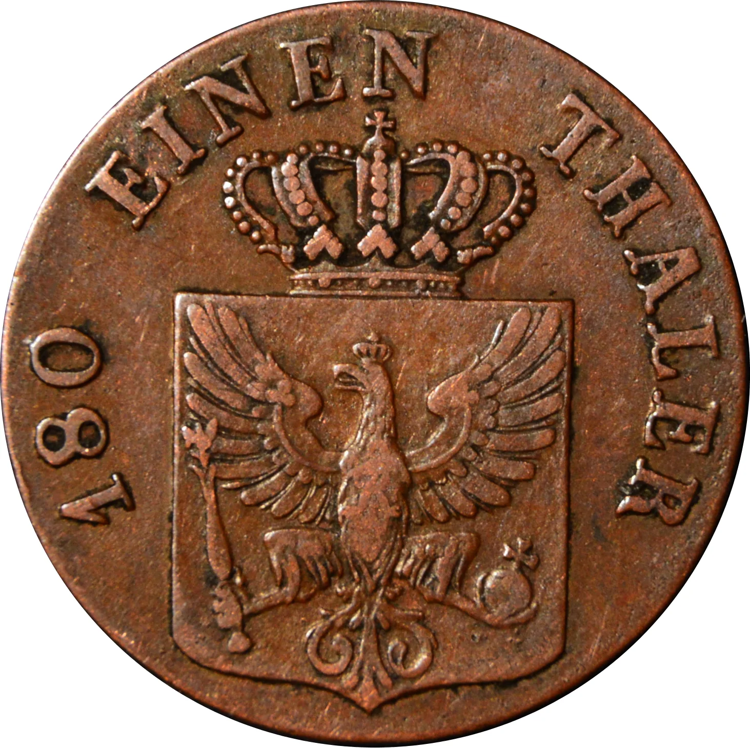 Prussian crowned eagle with scepter and globe, encircled by legend and grenetis.