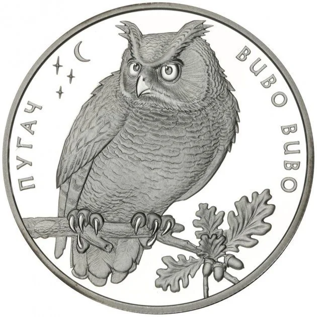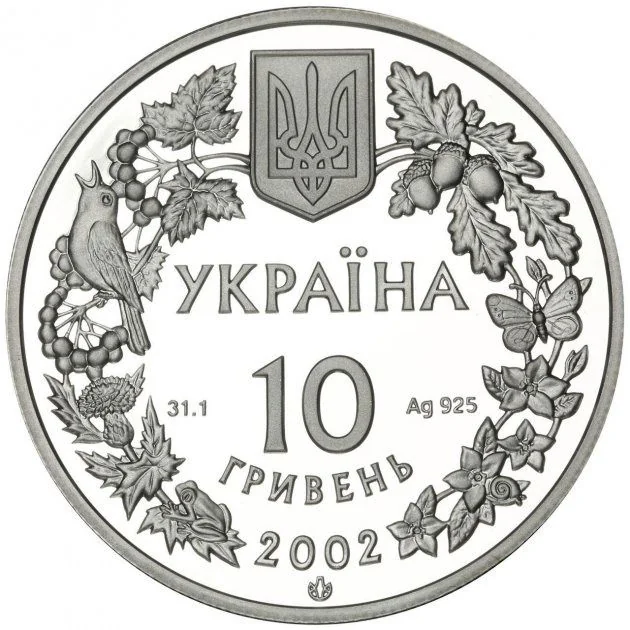 Description: The small State Emblem of Ukraine is centered within a frame of flora and fauna, surrounded by the inscriptions "УКРАЇНА / 10 / ГРИВЕНЬ / 2002," the metal specifications, and the Mint logo of the National Bank of Ukraine.
