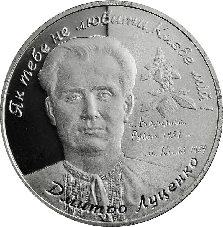 Description: A portrait of Dmytro Lutsenko is flanked by two chestnut blossoms and the text "Березова Рудка 1921 Київ 1989". Above, an arc reads "ЯК ТЕБЕ НЕ ЛЮБИТИ, КИЄВЕ МІЙ!" and below, "ДМИТРО ЛУЦЕНКО".