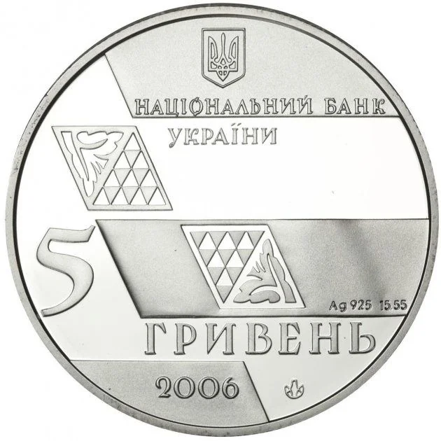 Description: Above the Small National Emblem of Ukraine is the text "НАЦІОНАЛЬНИЙ БАНК УКРАЇНИ." Diagonal ornamental elements frame the left side, which features the coin's face value "5 ГРИВЕНЬ 2006," the metal Ag 925, and its fine weight. The mint's logotype is also present.