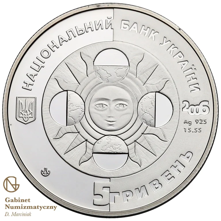 Description: The central circle features a stylized sun surrounded by four smaller suns, representing the seasons. To the left is the Small State Emblem of Ukraine; to the right is the year 2006, Ag 925, and 15.55g. The circumference bears the inscriptions "НАЦІОНАЛЬНИЙ БАНК УКРАЇНИ" above and "5 ГРИВЕНЬ" below, along with the Mint's logotype.