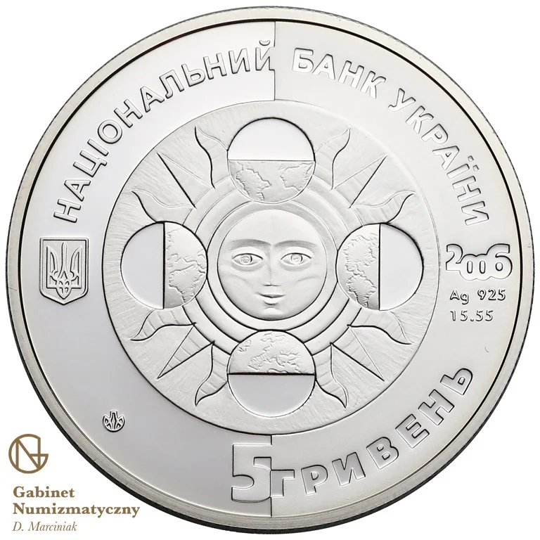 Description: A central sun is flanked by four spheres representing the seasons. To its left is the Small State Emblem of Ukraine; to its right, the year 2006, Ag 925, and 15.55g. Around the circumference: "НАЦІОНАЛЬНИЙ БАНК УКРАЇНИ" (above), "5 ГРИВЕНЬ" (below), and the Mint logo.
