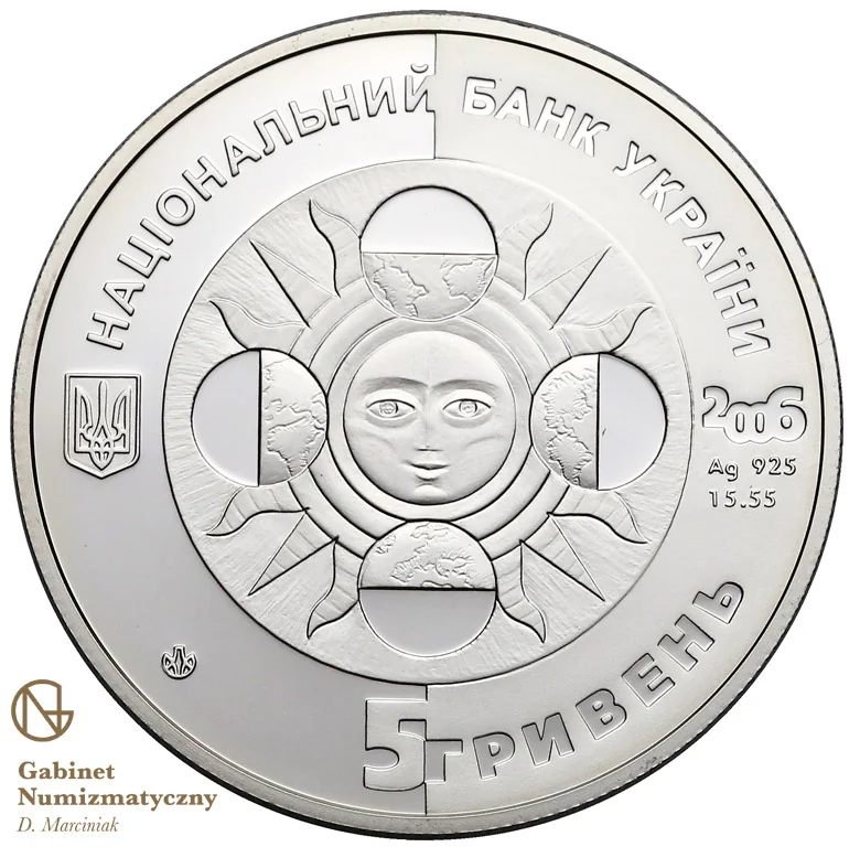 Description: A central sun is flanked by four spheres representing the seasons. To its left is the Small State Emblem of Ukraine; to its right, the year 2006, Ag 925, and 15.55g. Around the circumference: "НАЦІОНАЛЬНИЙ БАНК УКРАЇНИ" (above), "5 ГРИВЕНЬ" (below), and the Mint logo.