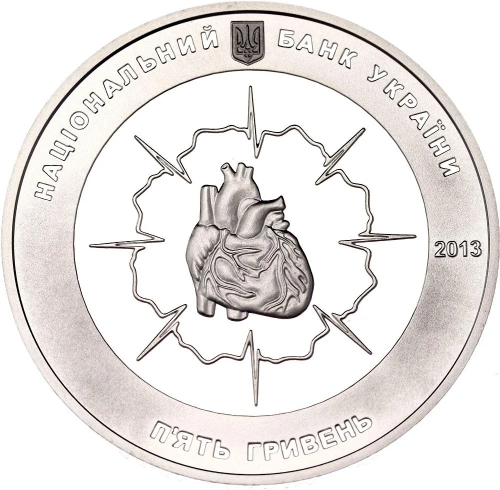 The obverse features Ukraine's small coat of arms with the inscription "National Bank of Ukraine." The central design is a heart encircled by a stylized electrocardiogram, with the year 2013 to the right and the face value "five hryvnias" below.