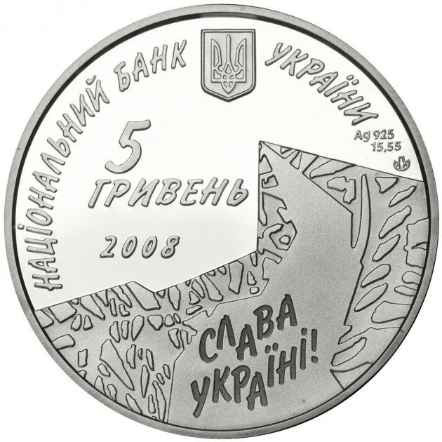Description: A broken uphill road, with the inscription "СЛАВА/ УКРАЇНІ!" in the background. Above it are the Small National Emblem of Ukraine and the semi-circular text "НАЦІОНАЛЬНИЙ БАНК УКРАЇНИ". Below are the face value "П’ЯТЬ ГРИВЕНЬ", metal specification "Ag 925", fine weight "15.55 g", and the Mint's logotype.