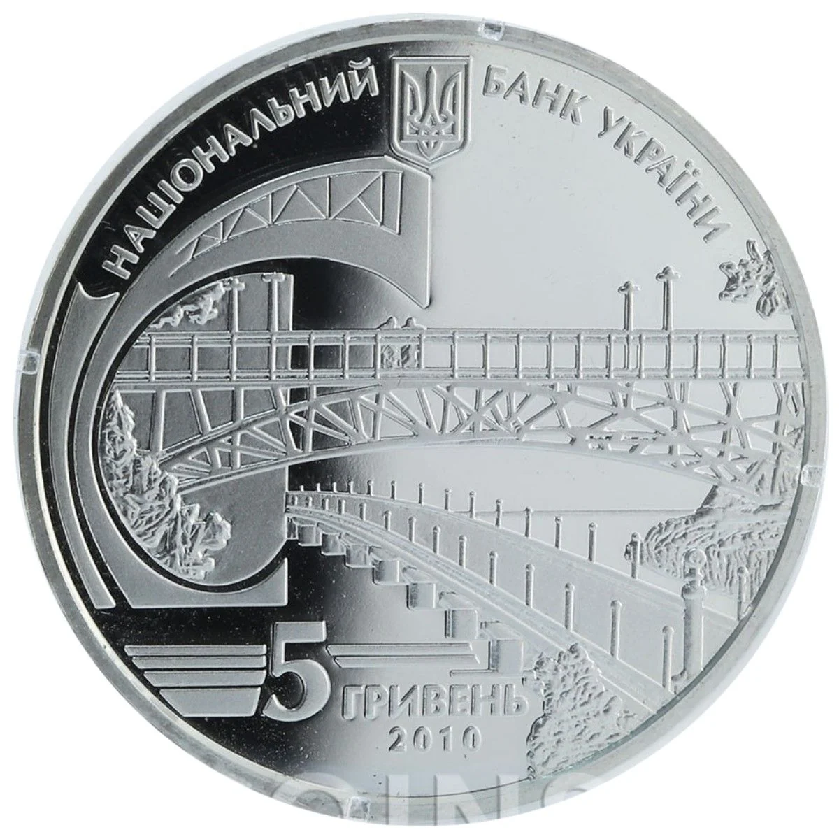 The obverse features the National Bank of Ukraine's coat of arms and name. The central design, symbolizing bridge engineering, depicts the welded Paton Bridge, a footbridge, and a stylized paper sheet. The denomination "5 ГРИВЕНЬ/2010" is below.