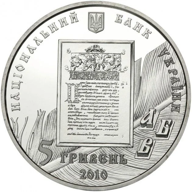 The obverse features Ukraine's small coat of arms with the legend "НАЦІОНАЛЬНИЙ БАНК УКРАЇНИ." Centered on a quill pen background is a matrix plate from the "Apostol," with the denomination "5 ГРИВЕНЬ" and year 2010 below.