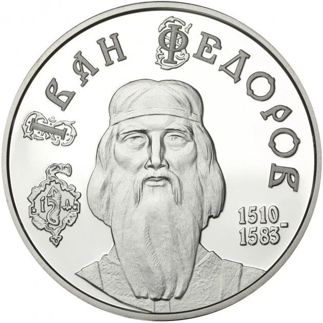 Portrait of Ivan Fedorov, flanked by his imprint (left) and his lifespan 1510/1583.