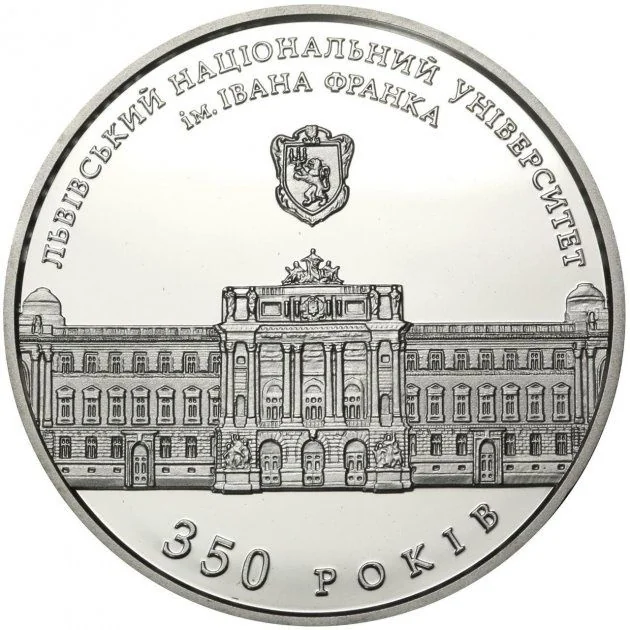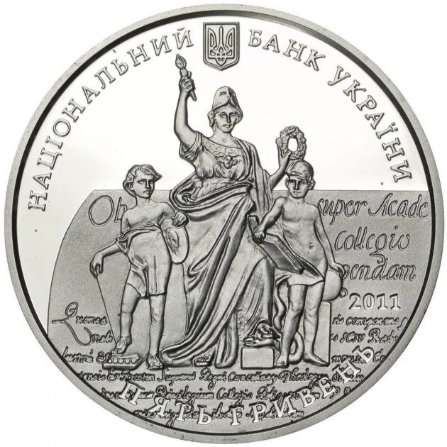 Description: Depicted: Ukraine's Small Coat of Arms and the semicircular inscription "НАЦІОНАЛЬНИЙ БАНК УКРАЇНИ" above. Centered, against a stylized university foundation document, is an allegorical statue group symbolizing education. Below is the bow-shaped face value and mintage year: "П'ЯТЬ ГРИВЕНЬ, 2011" with the National Bank of Ukraine Mint logotype.