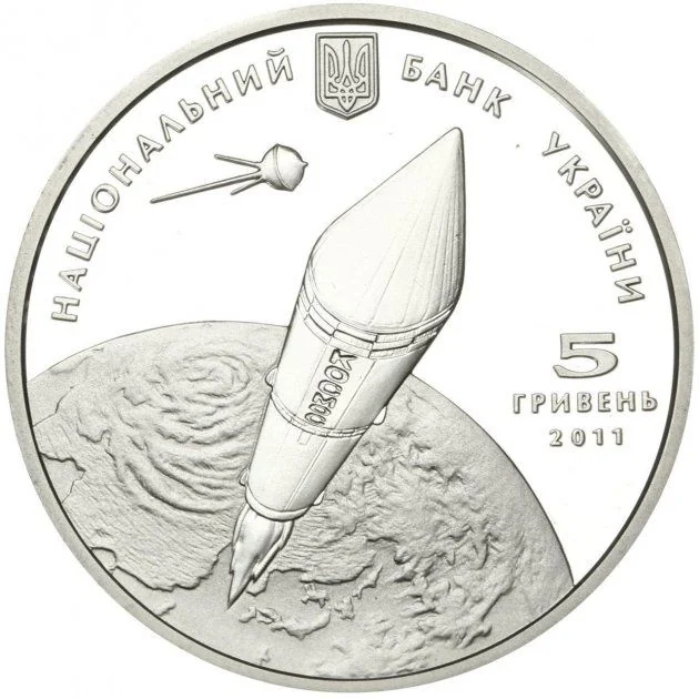 Above is Ukraine's Small Coat of Arms with the legend "National Bank of Ukraine." Below is a stylized depiction of the first Kosmos rocket and satellite from the OKB-586 Design Bureau. To the right are the denomination and year: 5 hryvnias, 2011.