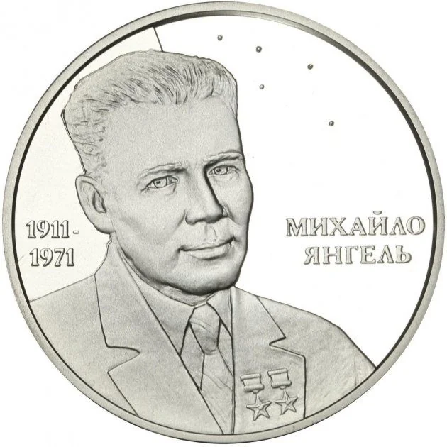 A portrait of Mykhailo Yangel (1911–1971) with his name in Ukrainian to the right.