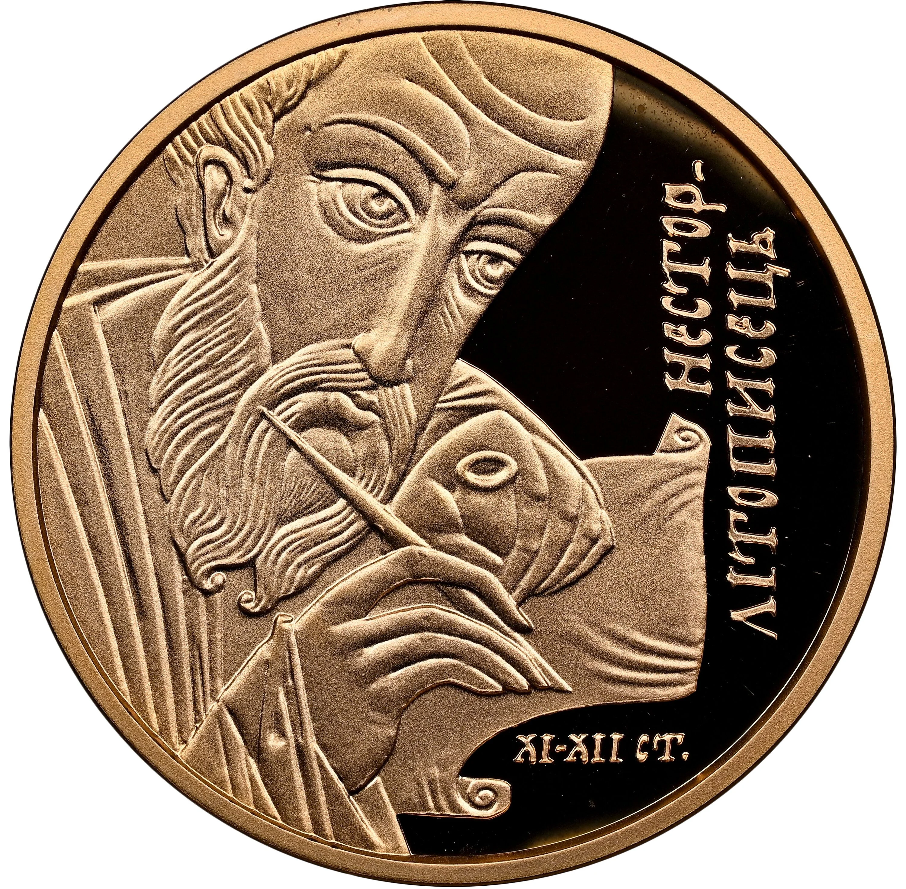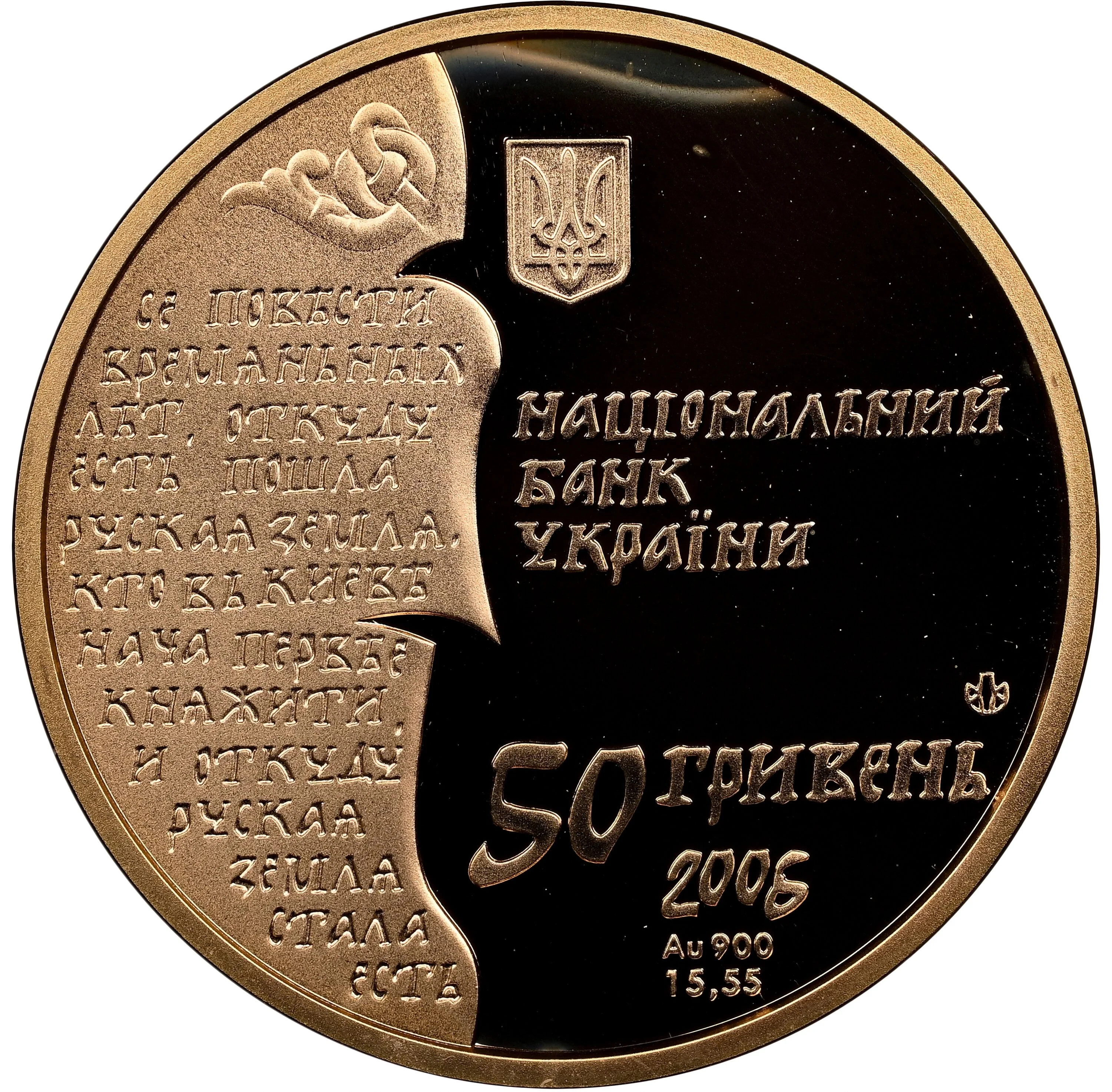 Description: The coin features a stylized fragment from the Tale of Bygone Years. Centered above is the Small National Emblem of Ukraine, with the inscriptions "НАЦІОНАЛЬНИЙ БАНК УКРАЇНИ" and "50 ГРИВЕНЬ." Below are the year 2006, metal specification "Au 900," fine weight "15,55 g," and the Mint's logotype.