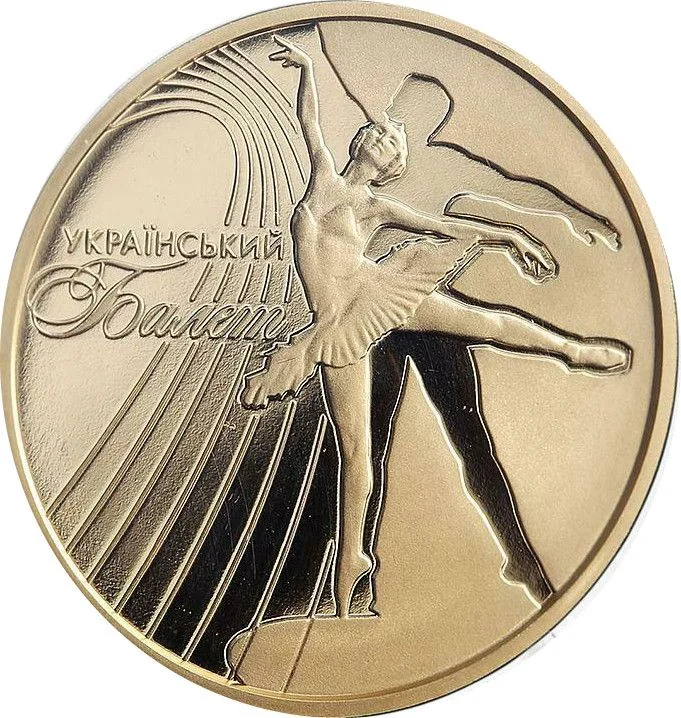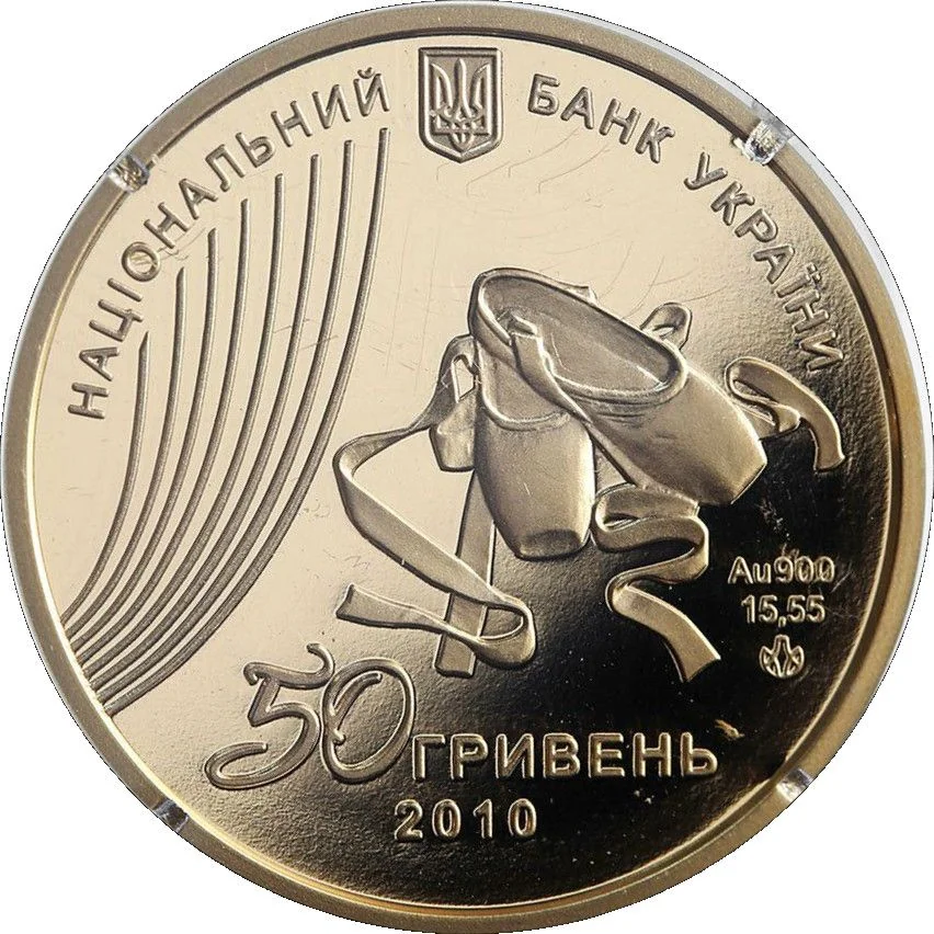 The obverse features the Small Coat of Arms, the inscription "НАЦІОНАЛЬНИЙ БАНК УКРАЇНИ", the face value "50 ГРИВЕНЬ" and year "2010", metal details (Au 900, 15.55 g), the Mint's logotype, a stylized drop-curtain, and pointe shoes.