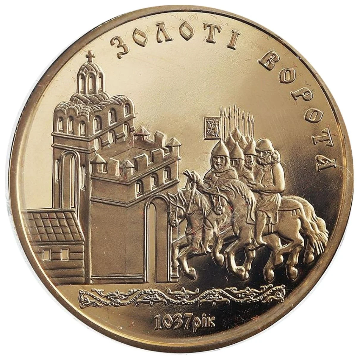 A stylized miniature depicts riders approaching gates. Above, a semicircular inscription reads "ЗОЛОТІ ВОРОТА," with the construction year "1037" below an ornamental stripe.