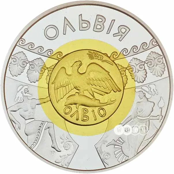 Description: A symbolic historical wheel features a falcon transforming into a trident above a snake, with the Ukrainian Small State Emblem above. The outer ring shows a potter on the left and a woman with children before a Greek column on the right, plus the Mint logo and inscriptions.