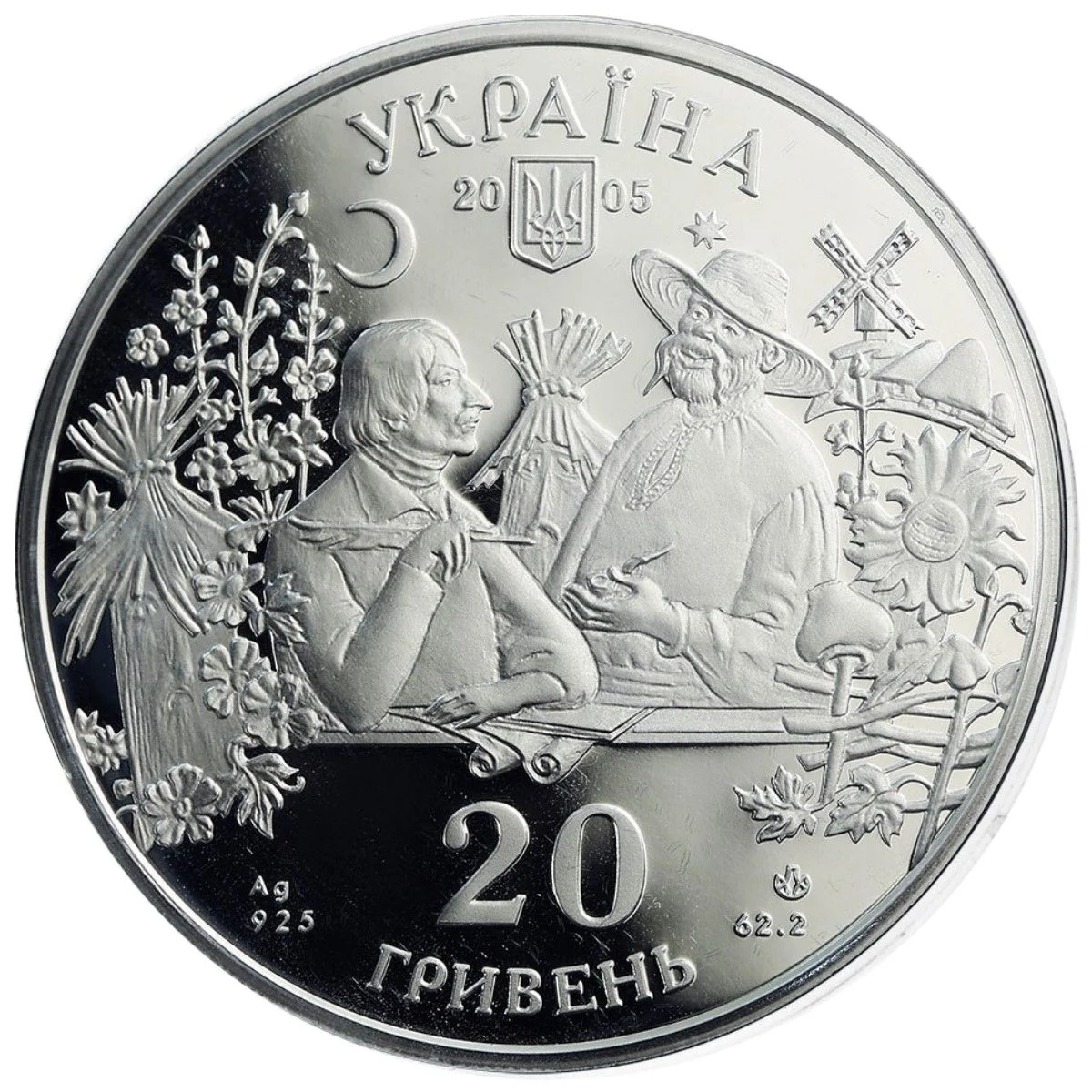Against a Ukrainian landscape, Mykola V. Hohol and his character Rudy Panko are depicted. Above them is the semicircular inscription "УКРАЇНА," and below are the small National Emblem, the year "20-05," the denomination "20/ ГРИВЕНЬ," the metal specification "Ag 925, 62,2 g," and the NBU Mint logotype.