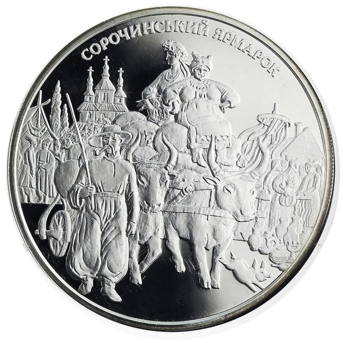 A multi-figured 19th-20th century country fair scene, topped by a semicircular inscription: СОРОЧИНСЬКИЙ ЯРМАРОК.