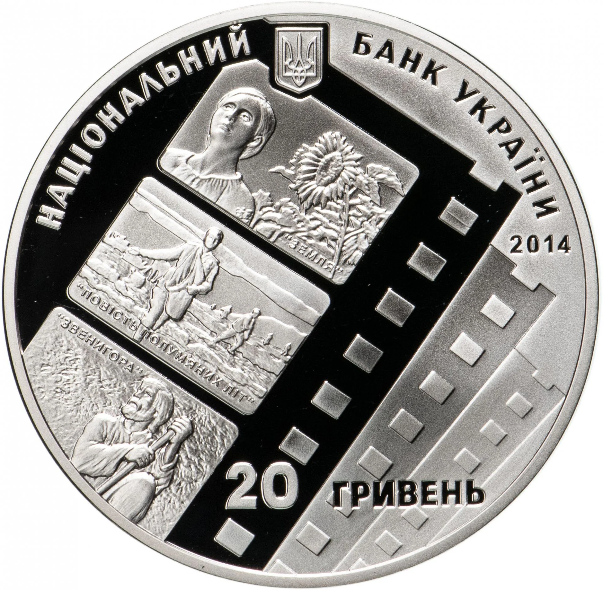 Above: Ukraine's small coat of arms with the inscription "National Bank of Ukraine" and the year 2014. Below: a stylized film strip with scenes from the movies *Earth*, *Chronicle of Flaming Years*, and *Zvenyhora*, above the face value of 20 hryvnias.