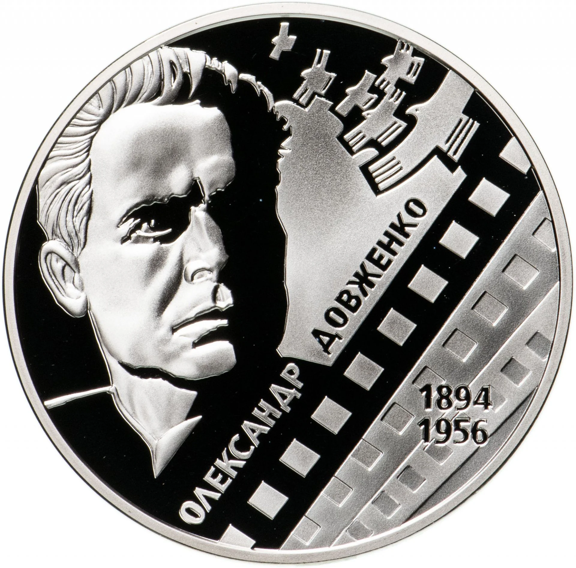 Featuring: a portrait of Oleksandr Dovzhenko (left); the diagonal inscription of his name; his lifespan 1894/1956 on a film strip background (right); and stylized birds representing his poetic imagery above.