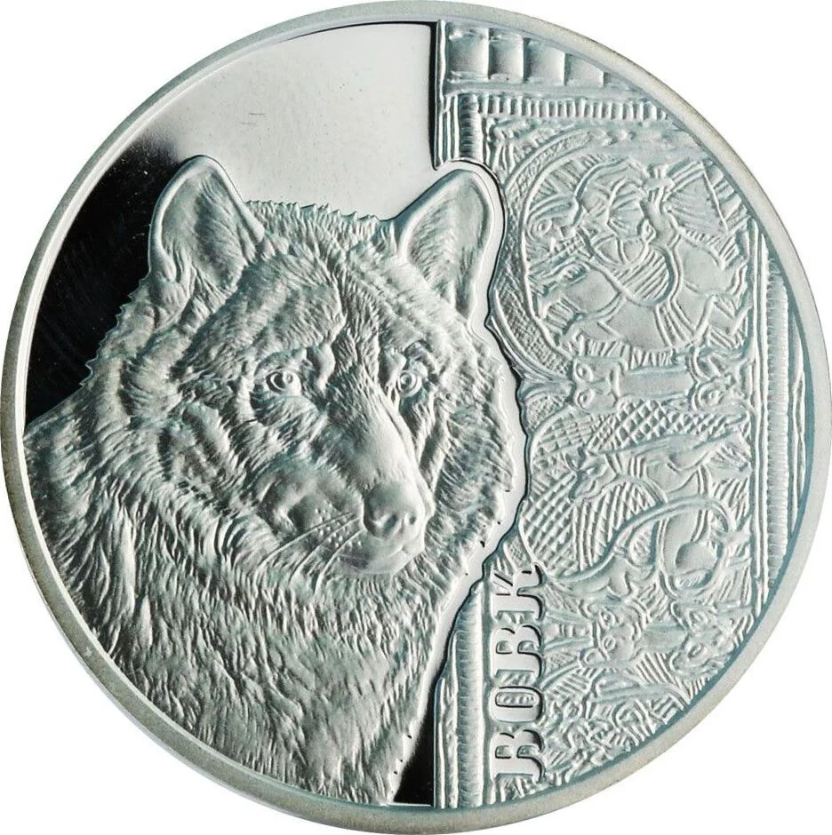 Ukraine's small coat of arms, the text "УКРАЇНА," the year 2016, and the face value of 5 hryvnias appear above. The center features a gilt fragment from a 10th-century rhyton (auroch's horn) found in the Black Grave in Chernihiv, depicting two fighting wolves, alongside an image of the original rhyton.