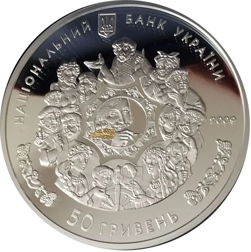A grotesque circular composition of "The Story-Teller and Listeners" from "Evenings on a Farm Near Dykanka" frames a central portrait of Gogol holding a quill. Above are the Ukrainian Small Coat of Arms and the inscription "НАЦІОНАЛЬНИЙ БАНК УКРАЇНИ"; below is the denomination "50 ГРИВЕНЬ".