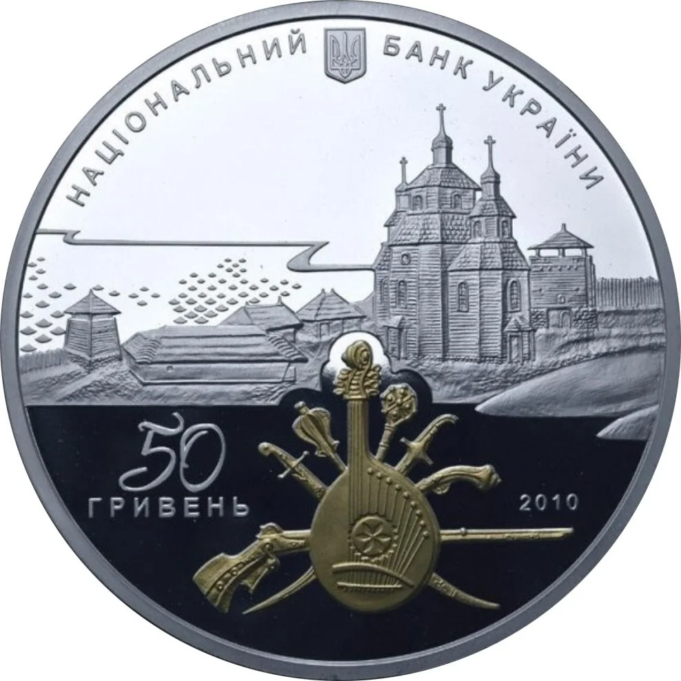 The obverse features Ukraine's Small Coat of Arms with the inscription "National Bank of Ukraine." The center depicts a fragment of the Zaporizka Sich heritage site, with a gilded composition of a bandura and Cossack arms and insignia in the foreground. The face value "50 hryvnias" is to the left and the issue year "2010" to the right.
