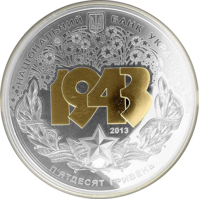 The obverse features Ukraine's Small Coat of Arms with the inscription "National Bank of Ukraine." The central composition symbolizes victory: the gilded date 1943 under fireworks, above a laurel wreath, ribbon, and star. To the right is the issue year 2013, and below, the bow-shaped inscription "Fifty Hryvnias."