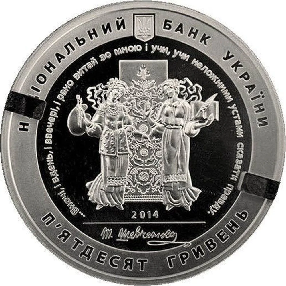 The obverse features Ukraine's Small Coat of Arms with the inscription "National Bank of Ukraine." Centered on a rushnyk (embroidered towel) background are two allegorical Muses, surrounded by lines from Shevchenko's poem "Muse." Below are the year 2014, Shevchenko's facsimile signature, and the face value "Fifty Hryvnias."