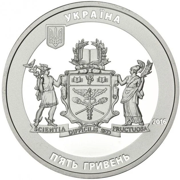 The coin features Ukraine's small coat of arms and the word "УКРАЇНА" above. Centered is the university's large coat of arms with the motto "SCIENTIA DIFFICILIS SED FRUCTUOSA." To the right is the year 2016, and below is the face value "П'ЯТЬ ГРИВЕНЬ."