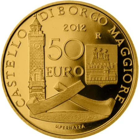 Borgo Maggiore Castle's main elements: the Clock Tower (left), Leonardo Blanco's "Diversi/Uguali" sculpture (center), and the castle's coat of arms (right).