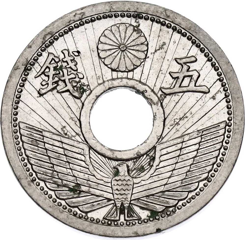 Chrysanthemum crest, imperial seal, and value around center hole. Stylized eagle with spread wings over rays below.