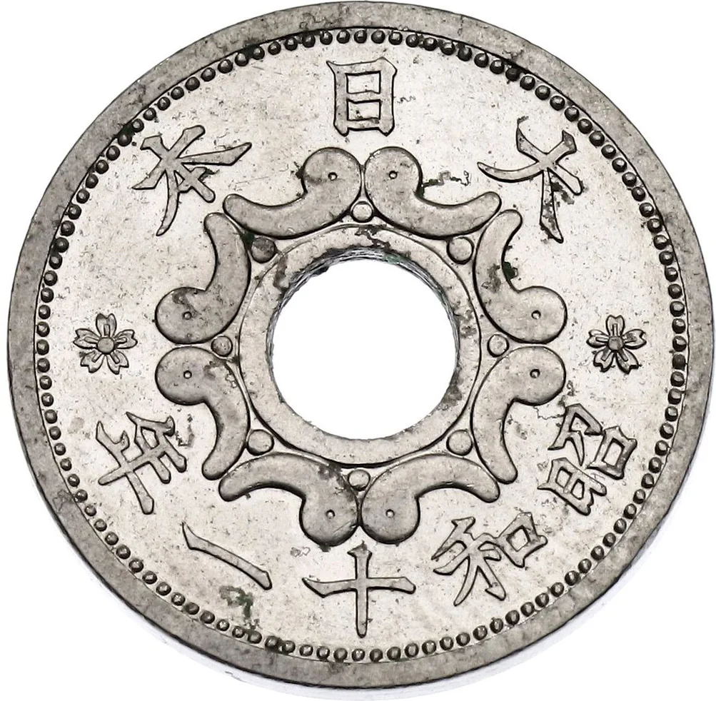 Issuing authority above, date below, hole encircled by magatamas.