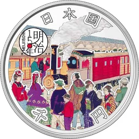 Colorized train station with MEIJI150th logo.