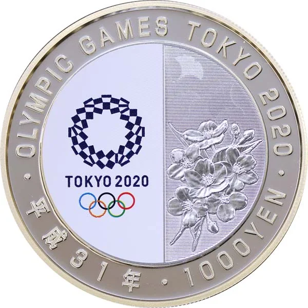 Tokyo 2020 Olympic emblem on left; right half features sakura and ginkgo leaves (Tokyo's tree). Colorized, encircled by text.