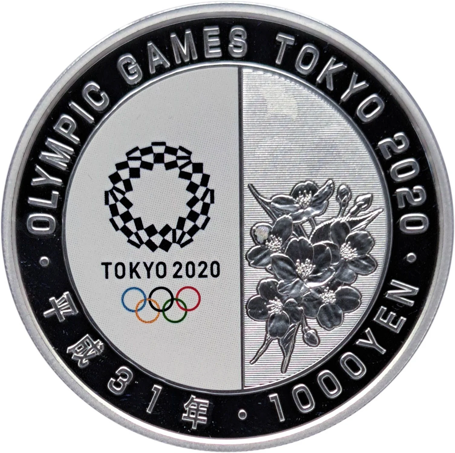 Tokyo 2020 Olympic emblem on left; right half features sakura and ginkgo leaves (Tokyo's tree). Colorized, encircled by text.