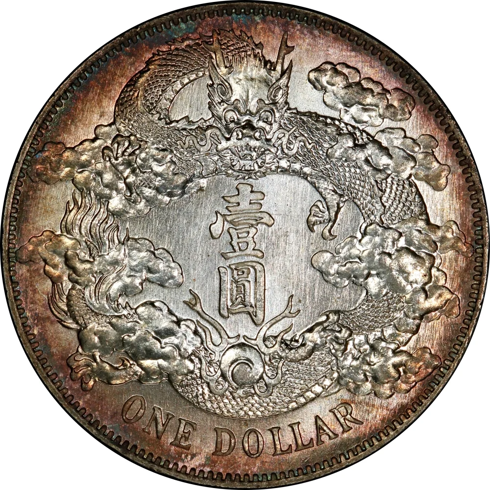 Dragon coiling left, holding a pearl, with central Chinese characters and English text below.