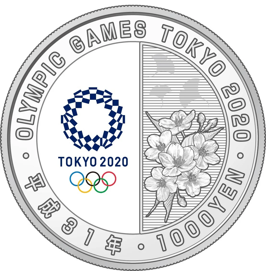 Tokyo 2020 Olympic emblem on left; right half features sakura and ginkgo leaves (Tokyo's tree). Colorized, encircled by text.