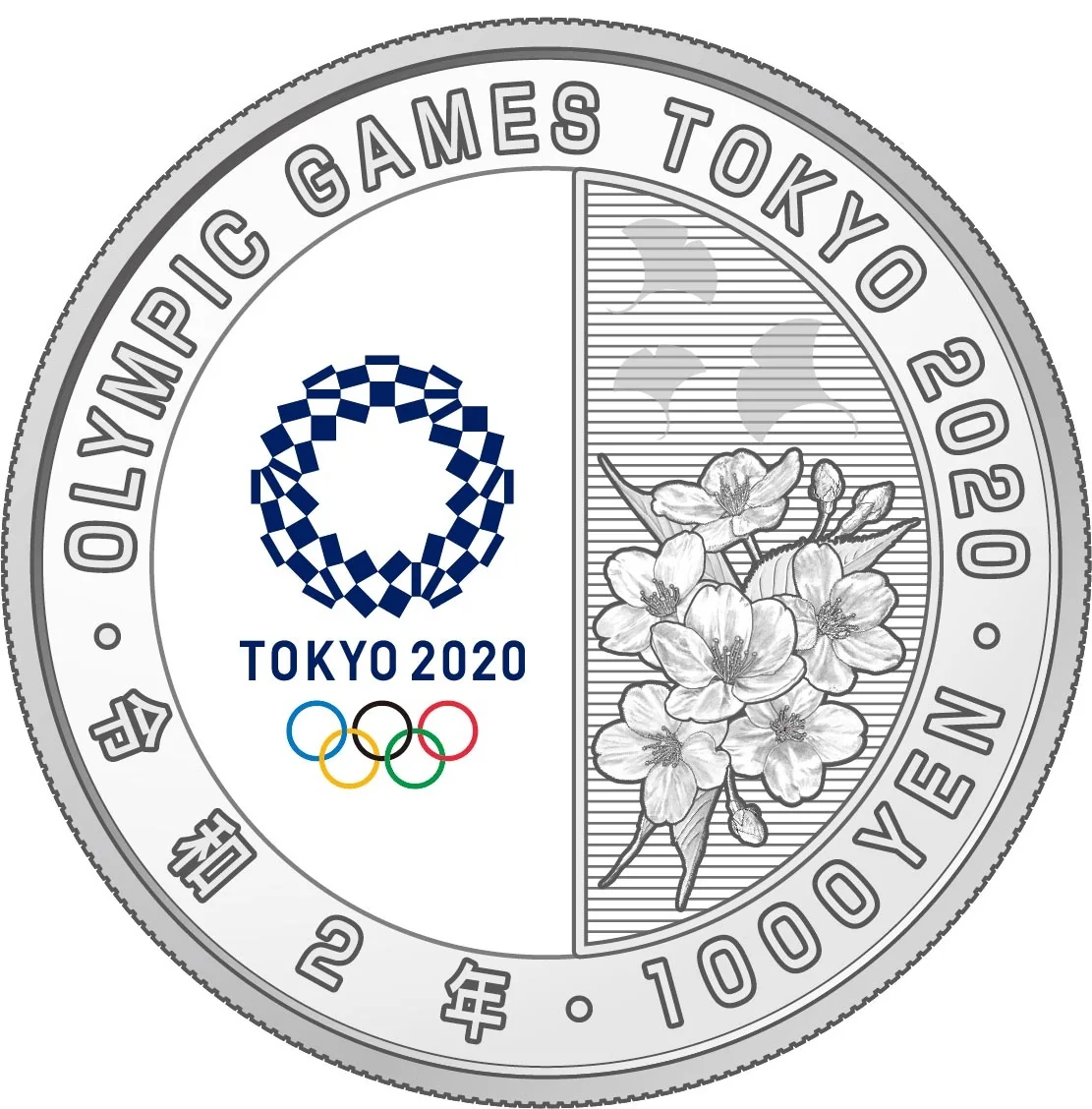 Tokyo 2020 Olympic emblem on left; right half features sakura and ginkgo leaves (Tokyo's tree). Colorized, encircled by text.