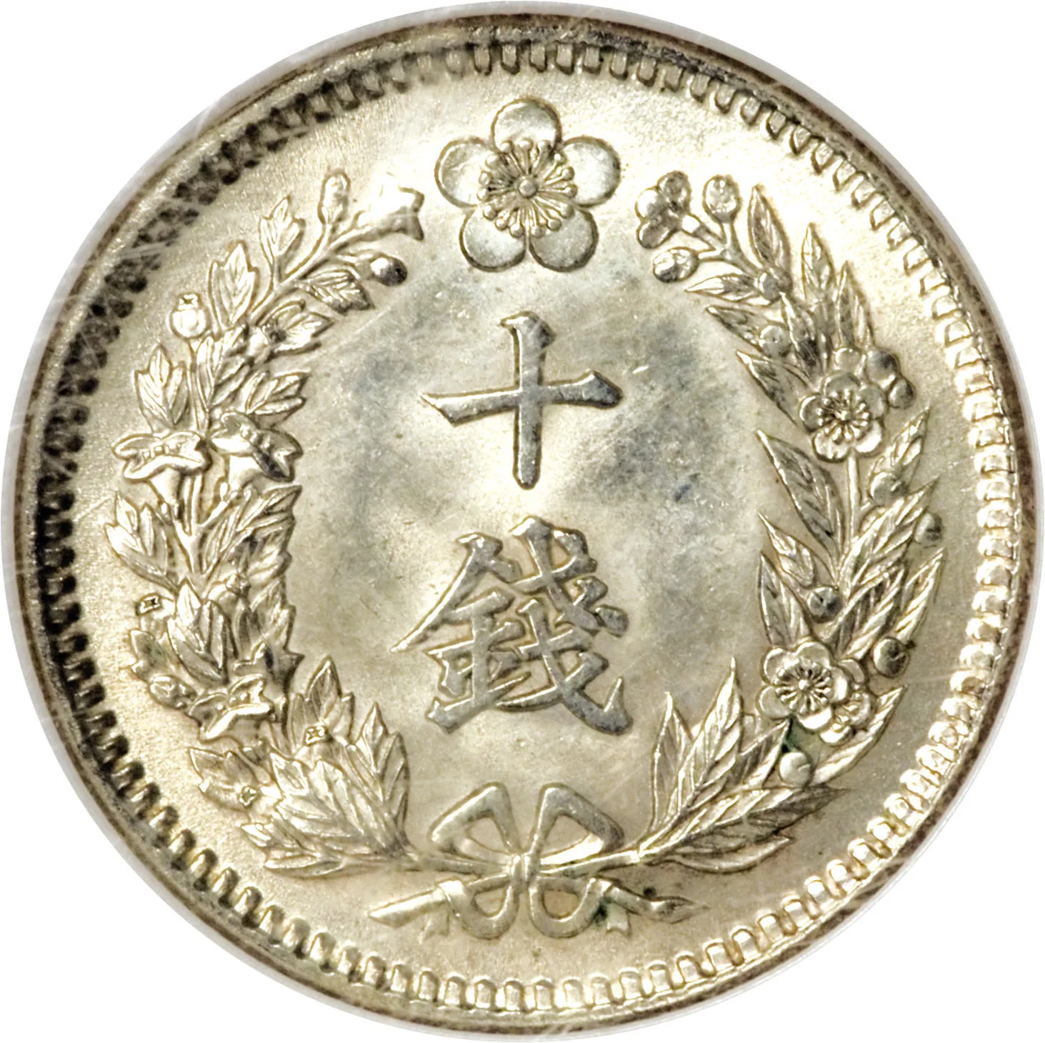 Denomination encircled by Rose of Sharon (left) and plum (right), with the Plum Blossom (Imperial Seal) above.
