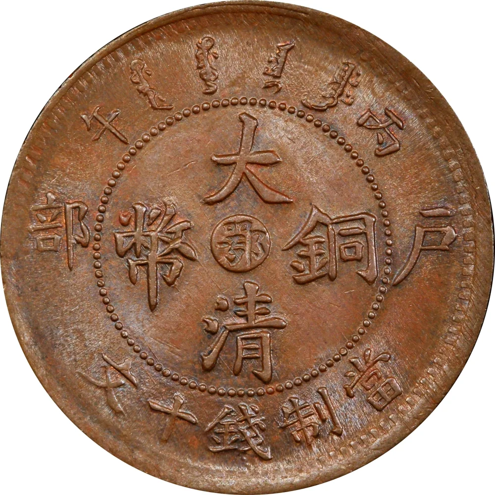 Made in the Year of Badarangga Doro (Daoguang Reign) Bing Wu. Board of Revenue. Large. Coin. E (provincial mint mark for Yunnan). Copper. Qing. Ten-Cash. Standard.