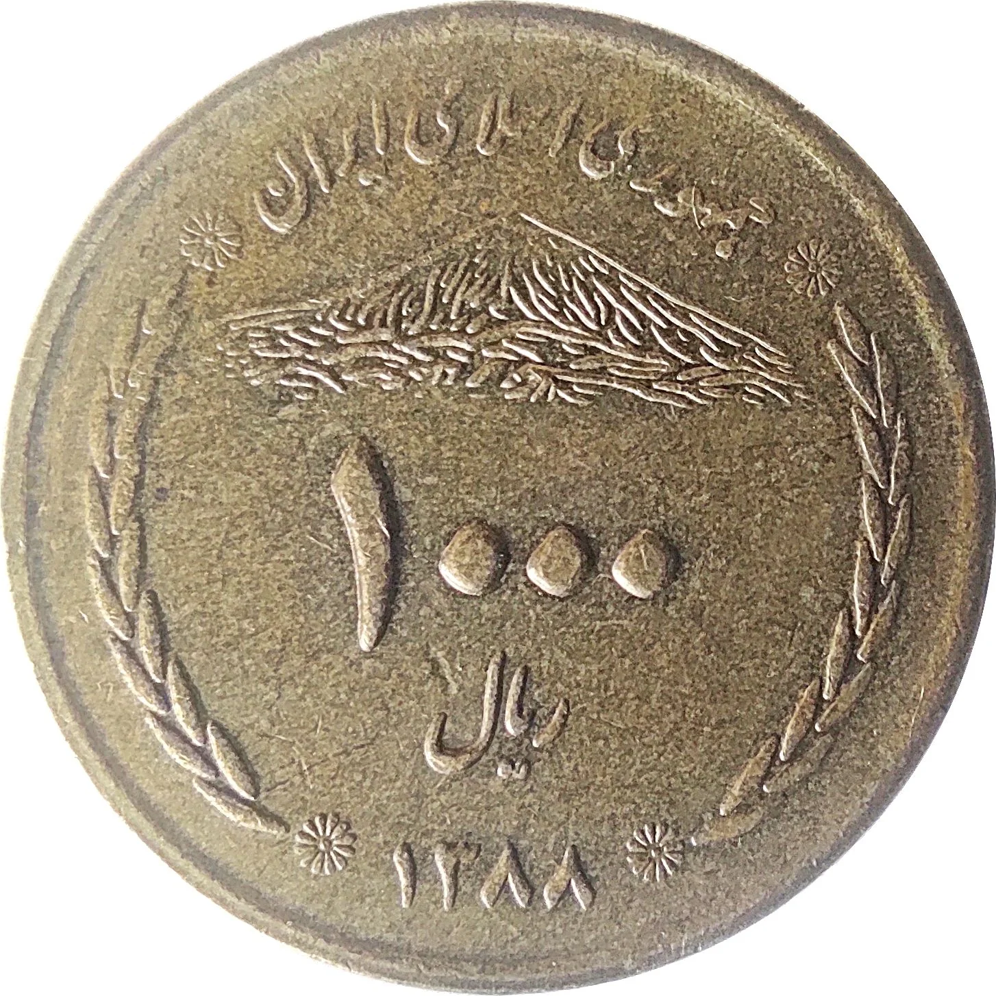 Center value, Mount Damavand above, date below, stylized side wreaths.