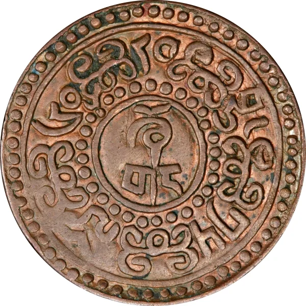 tangka (or srang), a coin minted by the government in Lhasa. These coins, often struck from melted-down silver dollars, varied in purity and weight, leading to fluctuations in their value. Alongside the tangka, a system of fractional copper coins called