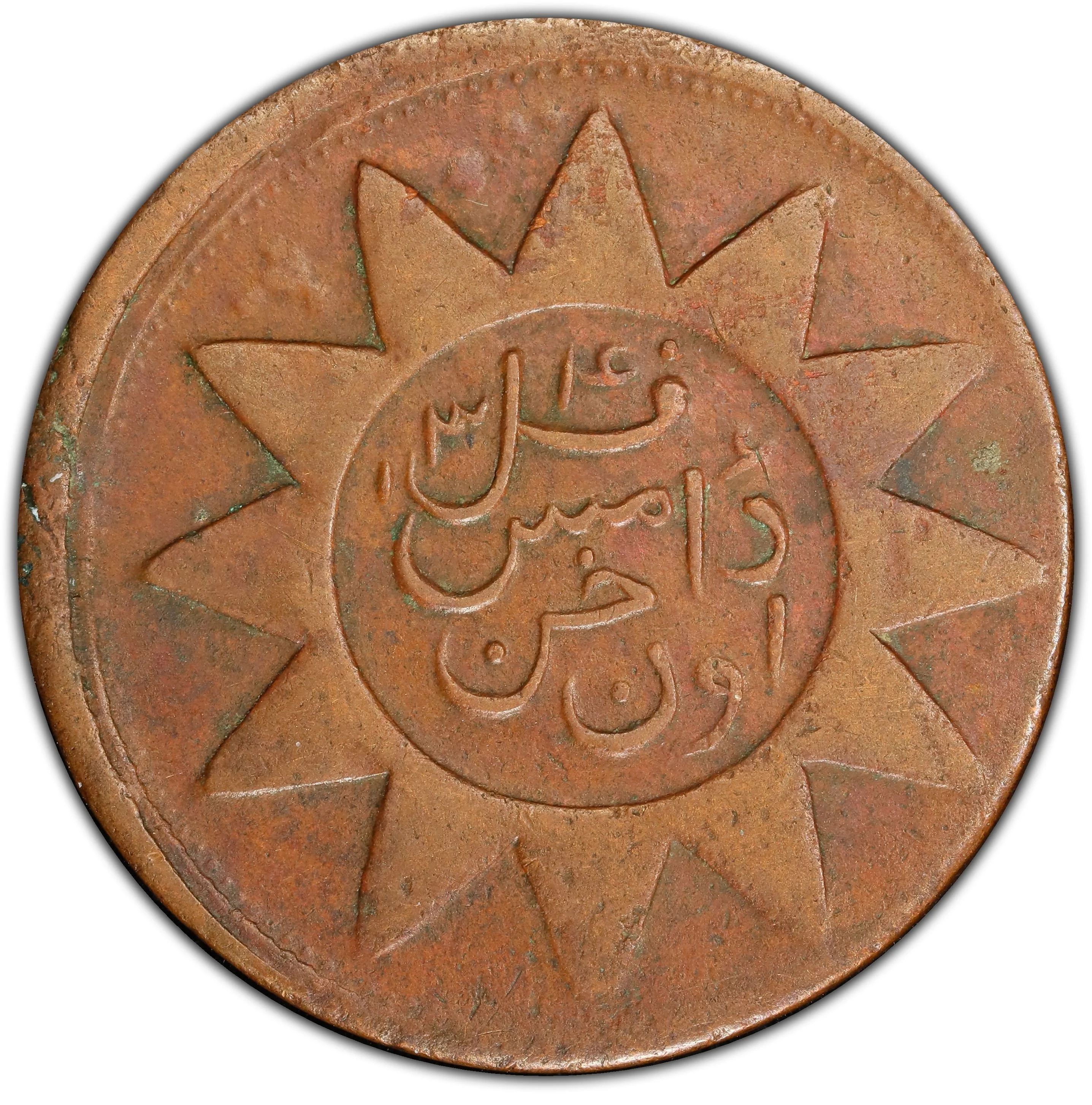 Arabic legend inside twelve-rayed sun.