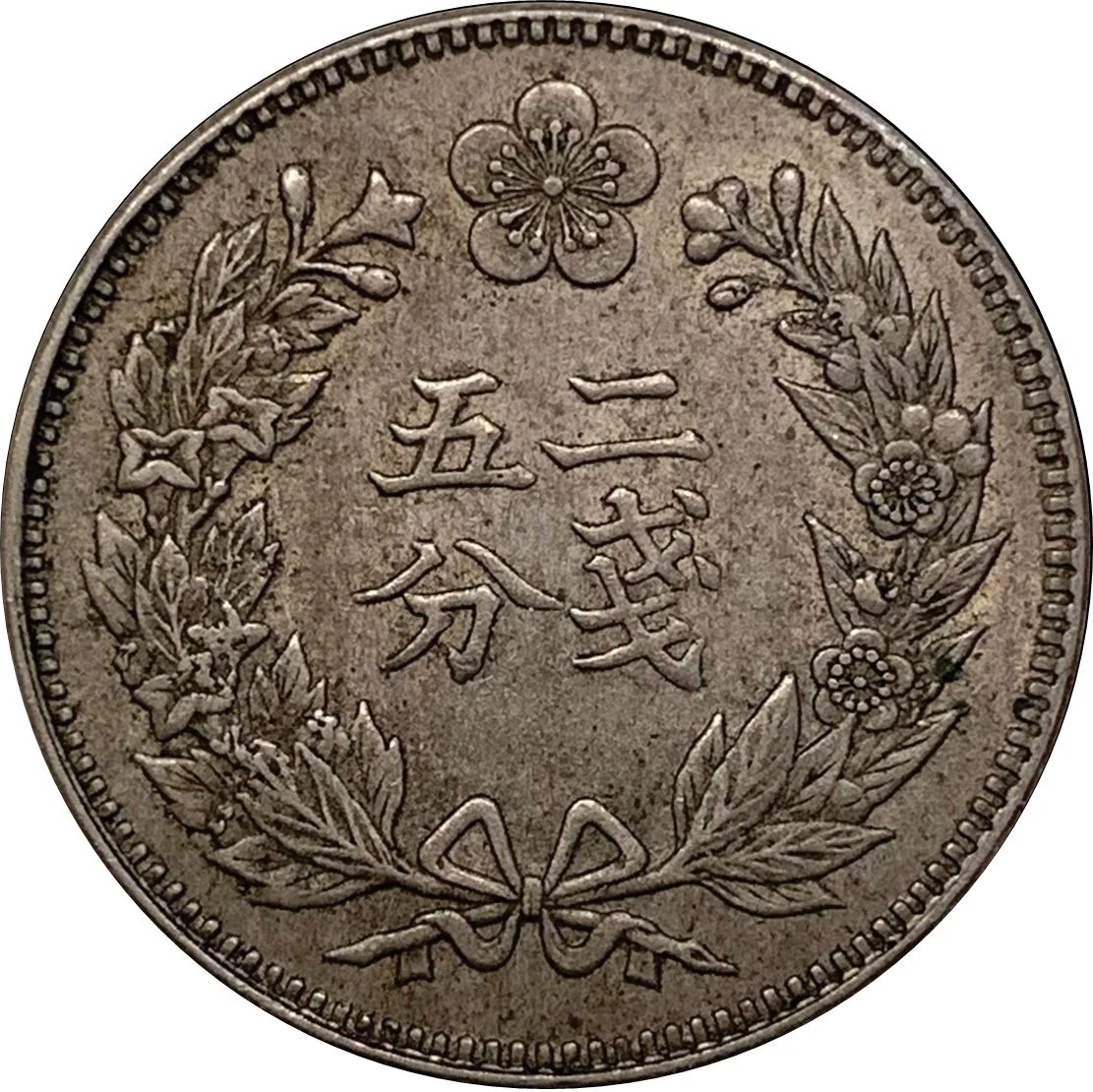 Denomination encircled by Rose of Sharon (left) and plum (right), with the Plum Blossom (Imperial Seal) above.