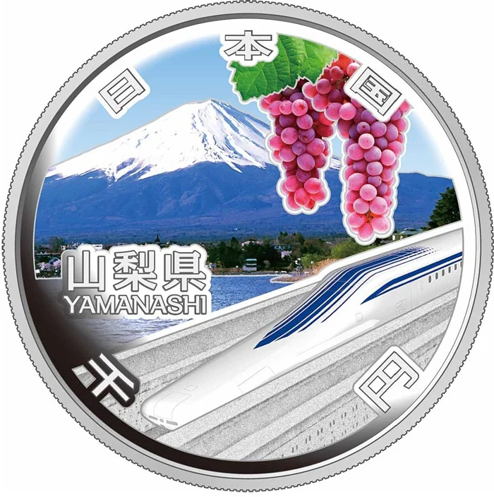 Mt. Fuji, a maglev train, and Kōshu grapes. Colorized.