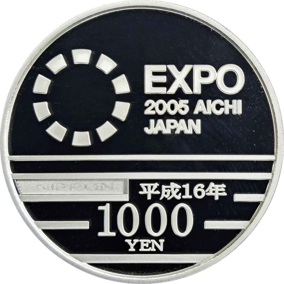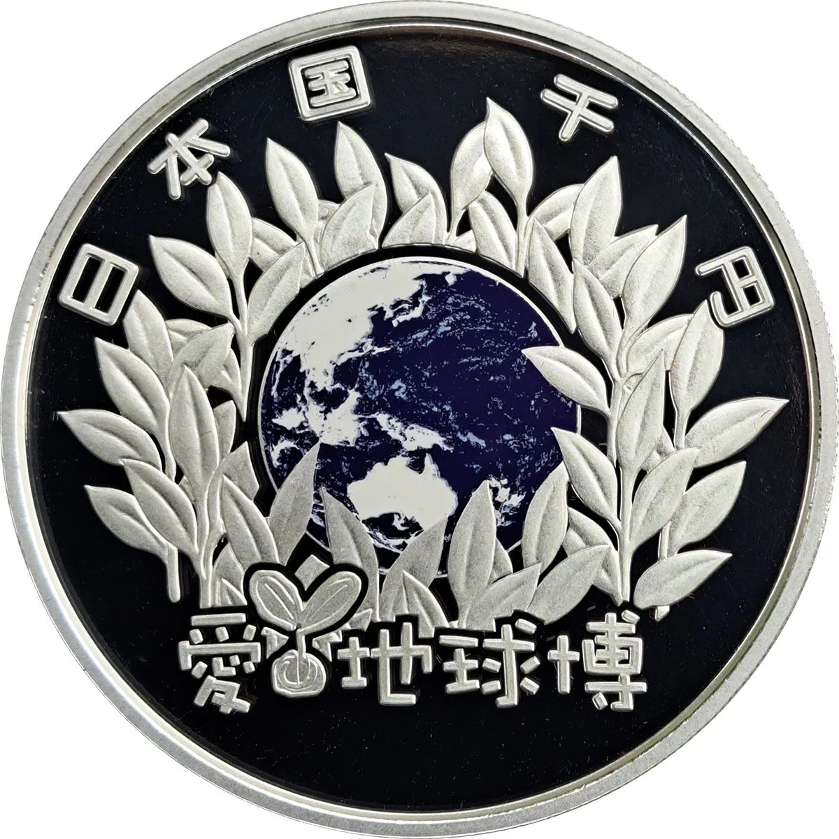 Pacific map in blue and white enamel within a wreath, featuring the Aichi Expo slogan.