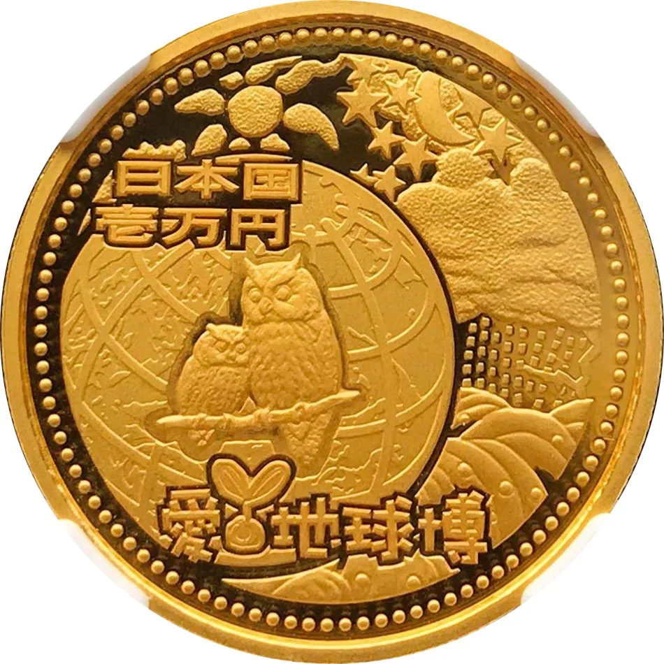 Two owls on a globe amid sun, moon, stars, and clouds, with the Aichi Expo slogan.